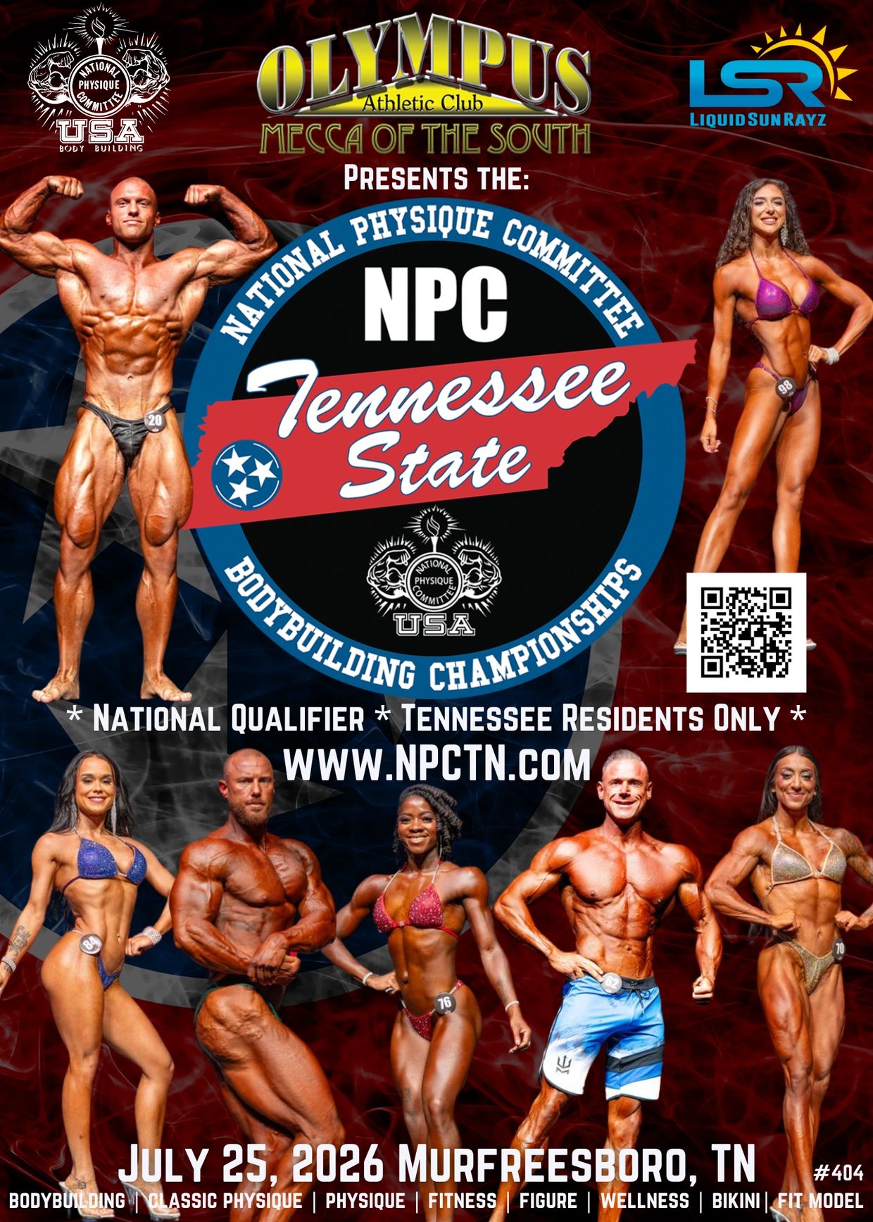 The 2025 NPC Tennessee State Championships takes place on July 26 in Murfreesboro, TN. This show includes NPC Bikini, Figure, Wellness, Fit Mode, Fitness, Women’s Physique, Mens Physique, Classic Physique, and Mens Bodybuilding.